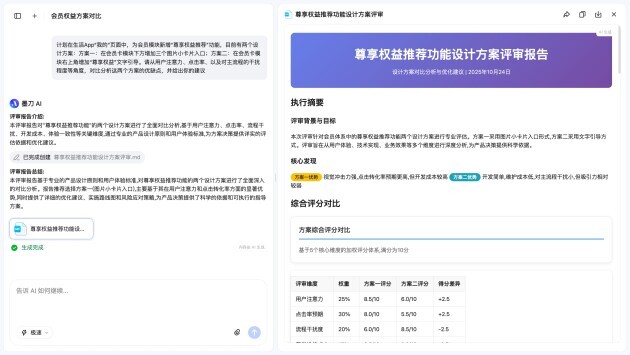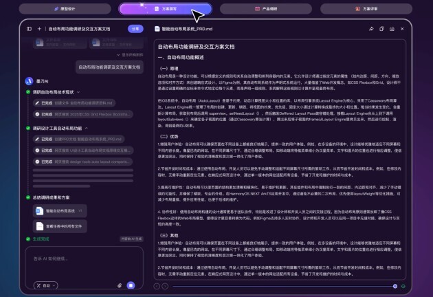 在众多功能中,AI方案评审尤其引发了业内关注。这项能力恰好补齐了当前多数AI工具在协作与思考层面的短板。它不仅能整合已有的调研文档、原型图与设计方案,还能提前识别潜在争议点,为团队提供更具针对性的决策参考。