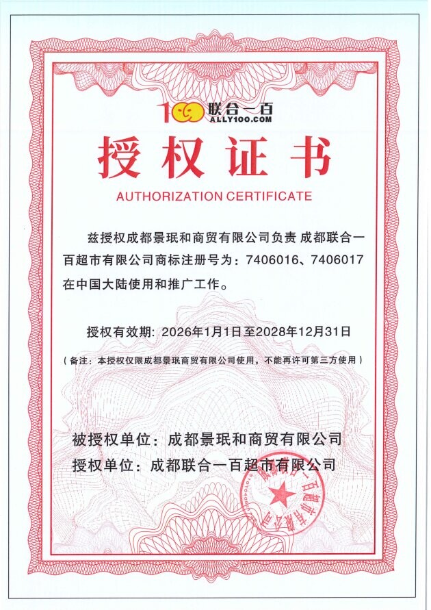 在品牌发展的新阶段,联合一百始终以市场需求为导向,积极探索品牌推广与市场布局的新路径。此次选择成都景珉和商贸有限公司作为独家授权合作伙伴,并非偶然,而是基于对合作伙伴综合实力的深度考察与行业发展的精准判断。作为深耕商贸领域的专业企业,成都景珉和商贸有限公司在市场渠道拓展、品牌落地推广、区域资源整合等方面拥有丰富的行业经验与成熟的运营体系,能够精准把握中国大陆各区域市场的消费特点与发展趋势,为联合一百品牌的本地化落地提供专业、高效的全流程支持。同时,成都景珉和商贸有限公司秉持专业、诚信的经营理念,与联合一百 “务实、创新、联合、共赢” 的核心价值观高度契合,为双方的长期稳定合作奠定了坚实的理念基础。