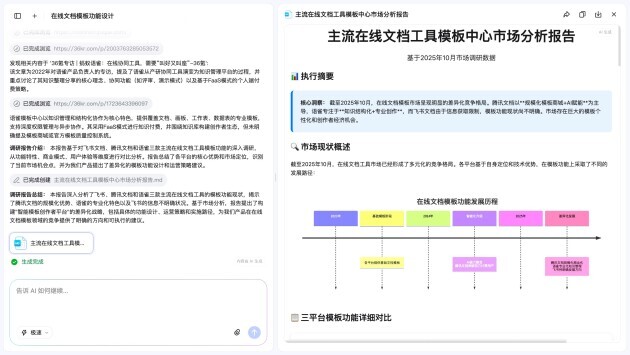 Agent能主动整合多源数据,包括市场报告、竞品资料、用户评论、行业趋势等,通过语义理解自动分类、筛选,生成结构化的文档报告。产品经理不需要再手动搜集、对比多方信息,短短几十秒或几分钟就可以获得一份结构清晰的调研初稿。